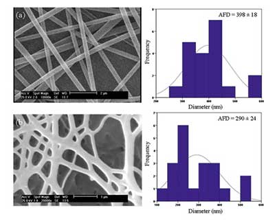 SEM顯微照片和纖維直徑分布:(a)PAN納米纖維,和(b)PAN衍生的活性炭纖維。