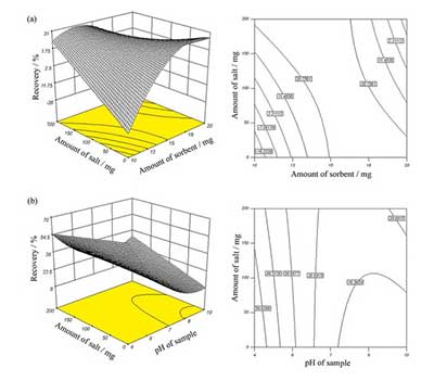 響應曲面和等高線圖顯示了:(a)鹽和吸附劑的量,和(b)鹽的量和溶液的pH對乙烯回收率的影響。