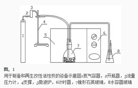 實驗在250毫升的錐形石英玻璃中進行(圖1)。圖中顯示了用于再生活性炭的實驗裝置(圖1)。再生之后,活性炭根據最優化的吸附條件。在這些條件下,活性炭的再生在幾次吸附之后進行1至10次再生循環幾次。活性炭的再生在氮氣流下進行(圖1)以避免活性炭的破壞。在我們以前的研究中,我們調查了改性活性炭的微波再生的最佳條件。活性炭根據最佳條件進行再生。