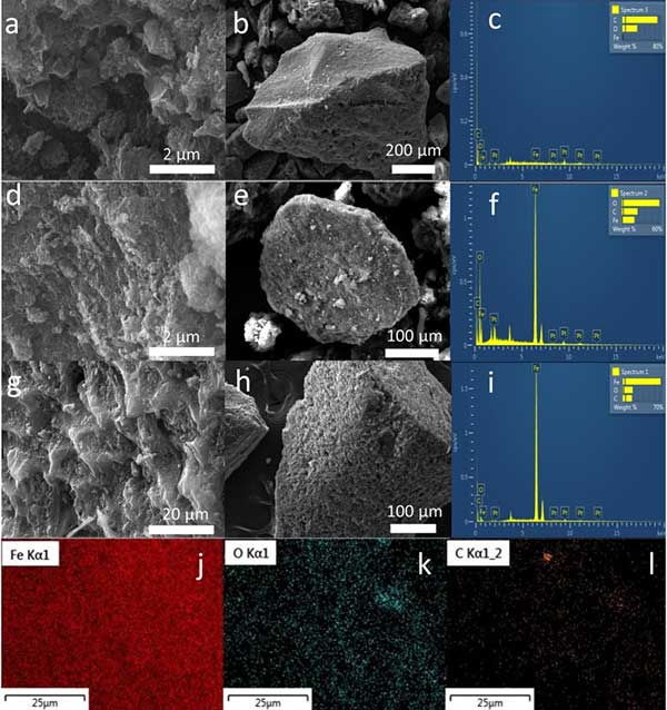 圖:1(ac)活性炭,(df)磁化活性炭-Fe(3.8%),(gi)磁化活性炭-Fe(8.6%)以及(j)Fe,(k)O和(l)C的元素映射的FESEM和EDS圖像為磁化活性炭-Fe(8.6%)。