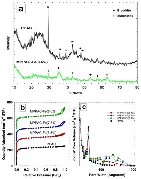 圖:2(a)活性炭和磁化活性炭-Fe的XRD圖譜(8.6%),(b)N 2氣吸附-解吸等溫線和(c)根據方程計算的活性炭孔隙寬度的微分孔體積,FAAS校正。