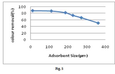 圖5顯示了活性炭顆粒尺寸對去除顏色的影響。從平臺上可以看出,對于固定的活性炭劑量,對于較小的吸附劑尺寸,顏色的去除率較高。此外,可以看出,隨著活性炭尺寸的幾何平均值的增加,去除百分比降低。這是因為,吸附是表面現(xiàn)象,較小的粒度提供相對較大的表面積,因此在平衡時發(fā)生較高的吸附。顆粒大小的影響為實現(xiàn)活性炭的最佳利用和填充床吸收器設計的穿透曲線的性質提供了重要的信息。