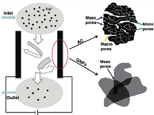 電容去離子技術(shù)采用活性炭和石墨烯納米片(GNFs)電極的機(jī)理。在研究人員進(jìn)行的實(shí)驗(yàn)中,他們將石墨烯納米片基電極與傳統(tǒng)活性炭電極進(jìn)行了比較。他們指出,“盡管具有較大的表面積(989.54米2 /克)比石墨烯納米薄片(222.01米2 / g)中,活性炭具有僅13.73微摩爾/克,這比石墨烯納米薄片的低得多的electrosorptive容量(其電吸附容量為23.18μmol/ g)“。