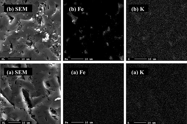 圖1.在活性炭(a)和活性炭負載六氰基鐵酸鉀(b)的橫截面上的SEM圖像和元素(Fe,K)分布。