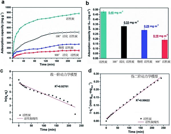 圖2、吸附動力學(xué)結(jié)果。(a)吸附能力隨時間的變化;(b)典型樣品的BET表面積的標(biāo)準(zhǔn)化吸附容量;(c)活性炭的偽一階動力學(xué)擬合;(d)活性炭的偽二階動力學(xué)擬合。